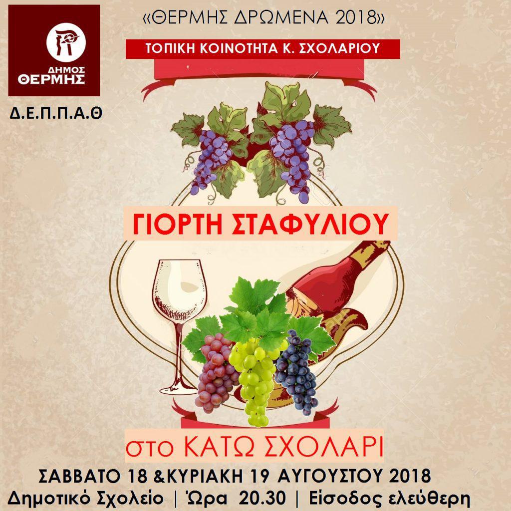 Ροζακί, Βικτώρια, μοσχάτο, ρεμπιέ, σουλτανίνα, ροδίτη, καμπερνέ και μαύρο σταφύλι χωρίς κουκούτσι, αλλά και γευστικό κρασί από τα σταφύλια της περιοχής θα έχουν την ευκαιρία να γευτούν οι επισκέπτες της γιορτής σταφυλιού και κρασιού, που συνδιοργανώνουν στις 18 και 19 Αυγούστου, στο Κάτω Σχολάρι, ο Δήμος Θέρμης