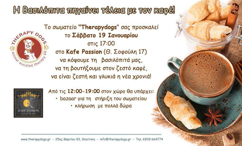 To Σάββατο το σωματείο Τherapy Dogs σας προσκαλεί στο Kafe Passion να κόψουμε τη βασιλόπιτά μας, να την βουτήξουμε στον ζεστό καφέ, να είναι ζεστή και γλυκιά η νέα χρονιά.