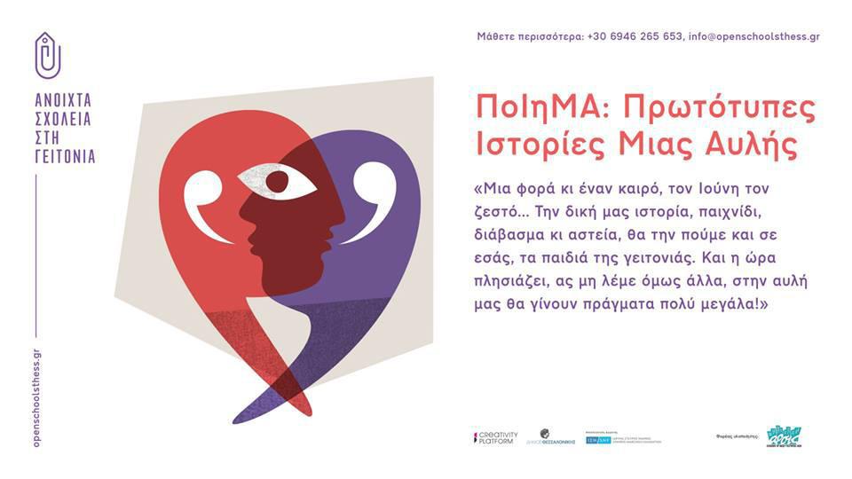 Σοκολάτα και καφέ πολυγλωσσίας, θεατρικό παιχνίδι, μουσική ενασχόληση,εικαστικά εργαστήρια πολυγλωσσίας,mobile school είναι κάποια από τα εργαστήρια που θα πλαισιώνουν το πρόγραμμα “ΠοΙηΜΑ- Πρωτότυπες Ιστορίες Μιας Αυλής” στα 6 #openschoolsthess