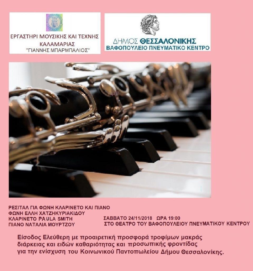 Ρεσιτάλ για φωνή, κλαρινέτο και πιάνο στο Βαφοπούλειο με προαιρετική προσφορά τροφίμων μακράς διάρκειας και ειδών καθαριότητας και προσωπικής φροντίδας για την ενίσχυση του Κοινωνικού Παντοπωλείου Δήμου Θεσσαλονίκης.