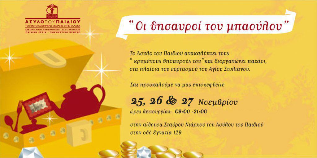 «Οι Θησαυροί του Μπαούλου» είναι ο τίτλος του bazaar που διοργανώνει το «Άσυλο του Παιδιού» στο πλαίσιο του εορτασμού του Αγίου Στυλιανού, προστάτη των παιδιών. Στο bazaar διατίθενται συλλογές χρηστικών και διακοσμητικών αντικειμένων, δωρεές ευαισθητοποιημένων συμπολιτών μας και εταιριών, χειροποίητες προσφορές των κυριών της Ομάδας Στήριξης καθώς και χριστουγεννιάτικα γλυκά και εδέσματα από την Κουζίνα του «Ασύλου του Παιδιού». Τα έσοδά του αξιοποιούνται για την ενίσχυση του εκπαιδευτικού και κοινωνικού έργου του «Ασύλου του Παιδιού», που φέτος συμπληρώνει 100 χρόνια αδιάλειπτης λειτουργίας.