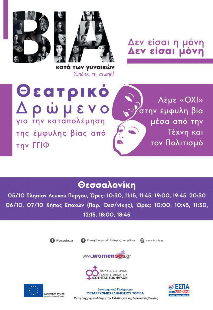 Η Γενική Γραμματεία Ισότητας των Φύλων (ΓΓΙΦ), στο πλαίσιο του συγχρηματοδοτούμενου έργου µε τίτλο: «ΣΧΕΔΙΑΣΜΟΣ ΚΑΙ ΑΝΑΠΤΥΞΗ ΔΡΑΣΕΩΝ ΔΗΜΟΣΙΟΤΗΤΑΣ (ΕΝΗΜΕΡΩΣΗ – ΕΥΑΙΣΘΗΤΟΠΟΙΗΣΗ) ΣΕ ΚΕΝΤΡΙΚΟ ΚΑΙ ΠΕΡΙΦΕΡΕΙΑΚΟ ΕΠΙΠΕΔΟ» ΤΗΣ ΠΡΑΞΗΣ ΜΕ ΤΙΤΛΟ «ΟΡΙΖΟΝΤΙΕΣ ΠΑΡΕΜΒΑΣΕΙΣ ΕΘΝΙΚΗΣ ΕΜΒΕΛΕΙΑΣ ΓΙΑ ΤΗΝ ΚΑΤΑΠΟΛΕΜΗΣΗ ΤΗΣ ΒΙΑΣ ΚΑΤΑ ΤΩΝ ΓΥΝΑΙΚΩΝ» του Ε.Π. ΜΕΤΑΡΡΥΘΜΙΣΗ ΔΗΜΟΣΙΟΥ ΤΟΜΕΑ, διοργανώνει Θεατρικά δρώμενα σε δώδεκα πόλεις της Ελλάδας τις περιόδους Ιουνίου-Ιουλίου 2018 και Σεπτεμβρίου-Οκτωβρίου 2018.