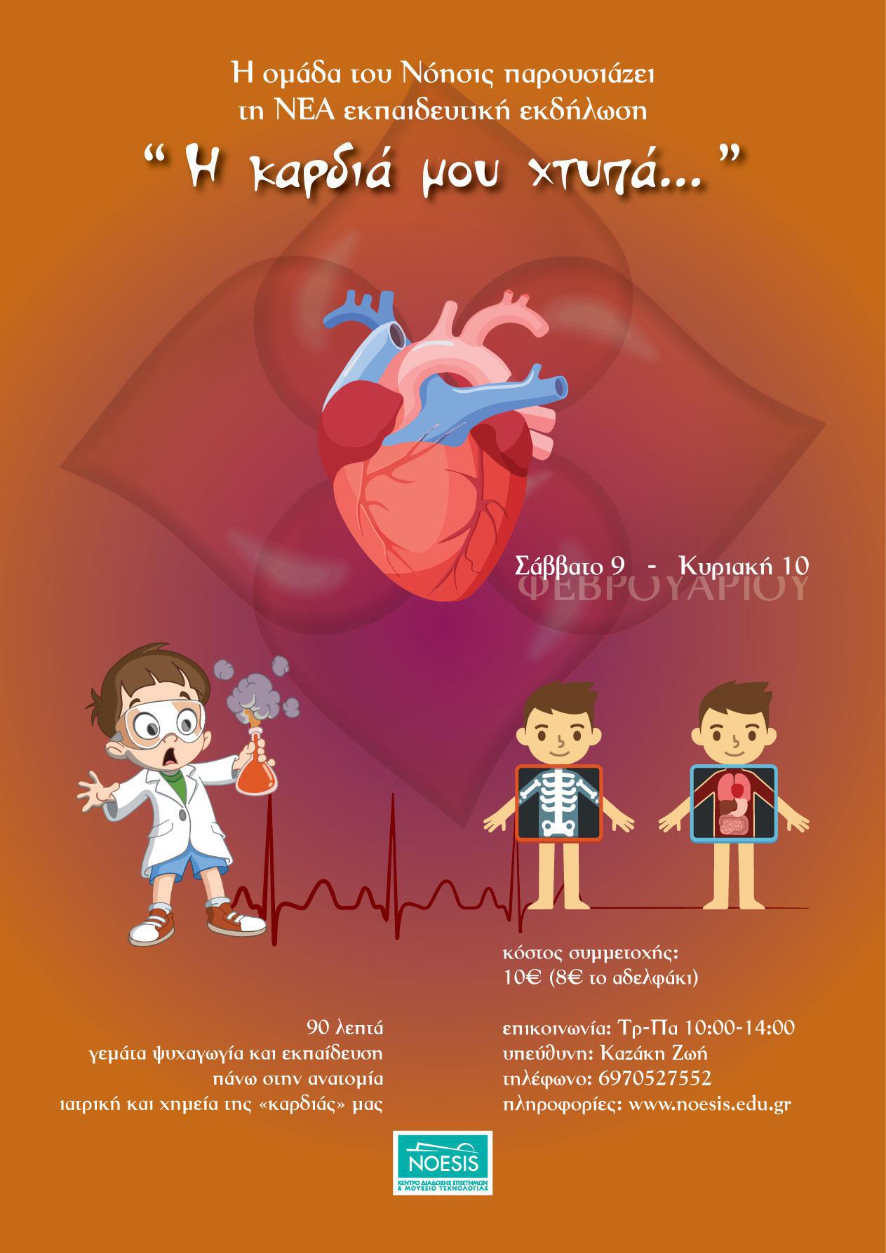 Το ΝΟΗΣΙΣ παρουσιάζει την NEA εκπαιδευτική εκδήλωση «Η καρδιά μου χτυπά…» για παιδιά από Β΄ μέχρι Ε΄ Δημοτικού και σας περιμένει να δηλώσετε συμμετοχή!Τι είναι η καρδιά και πώς λειτουργεί; Γνωρίζεις τι είναι ο σφυγμός και πώς τον μετράμε; Γιατί το αίμα έχει κόκκινο χρώμα; Αγαπάς τη γνώση μέσα από πειράματα και κατασκευές;
