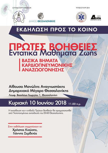Στόχος της εκδήλωσης είναι η εκπαίδευση και η ευαισθητοποίηση του κοινού στη σημασία της παροχής Πρώτων Βοηθειών. Κατά τη διάρκεια της εκδήλωσης, πιστοποιημένοι εκπαιδευτές του ΕΚΑΒ Θεσ/νίκης, παρουσία Ιατρών Εντατικής Θεραπείας, θα δείξουν στους πολίτες που θα συμμετέχουν βασικά βήματα καρδιοπνευμονικής αναζωογόνησης.