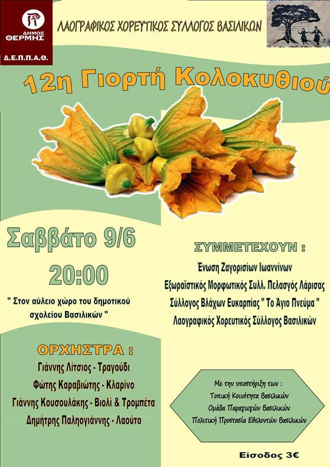 Ο ΛΑΟΓΡΑΦΙΚΟΣ ΧΟΡΕΥΤΙΚΟΣ ΣΥΛΛΟΓΟΣ ΒΑΣΙΛΙΚΩΝ διοργανώνει την «12η Γιορτή Κολοκυθιού » Σάββατο 9 ΙΟΥΝΙΟΥ 2018 στον αύλειο χώρο του Δημοτικού Σχολείου Βασιλικών.
