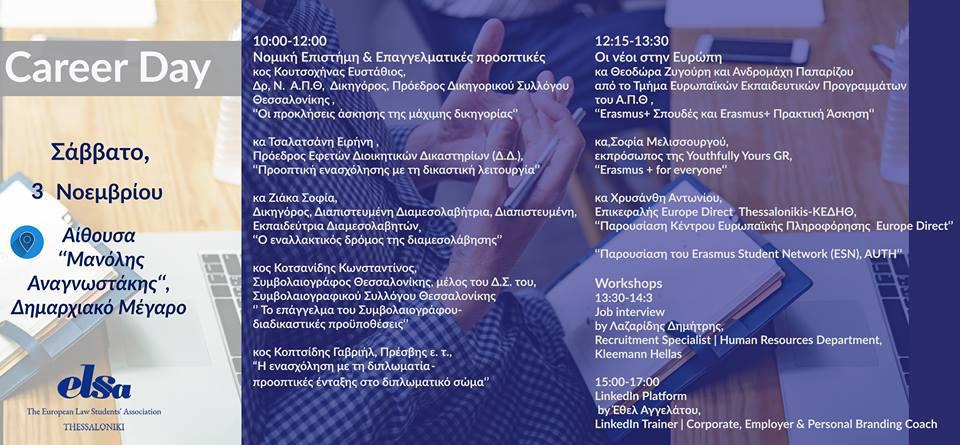 Η ELSA Thessaloniki – Ευρωπαϊκή Ένωση Νέων Νομικών στο Παράρτημα της Θεσσαλονίκης- διοργανώνει το πρώτο “Career Day” το οποίο θα διεξαχθεί το Σάββατο 3 Νοεμβρίου. Οι συμμετέχοντες θα έχουν την ευκαιρία να πληροφορηθούν για τις πραγματικές συνθήκες εργασίας, που επικρατούν σε κάθε επάγγελμα στον νομικό χώρο. Παράλληλα, θα έχουν τη δυνατότητα να λάβουν όλες τις πληροφορίες που επιθυμούν σχετικά με τα προγράμματα Erasmus και να ενημερωθούν σχετικά με το Κέντρο Ευρωπαϊκής Πληροφόρησης Europe Direct Thessalonikis – ΚΕΔΗΘ. Θα πραγματοποιηθούν δύο workshops που θα αφορούν το Job Interview και τη σύσταση επαγγελματικού προφίλ στο LinkedIn.