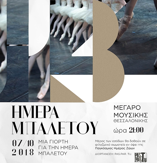 Η Pas Par Tu για δεύτερη συνεχόμενη χρονιά διοργανώνει τη 2η Γιορτή για την Ημέρα Μπαλέτου. Μετά την απρόσμενη περυσινή επιτυχία, θελήσαμε να καθιερώσουμε μια τέτοια γιορτή για τον κλασικό χορό. Είναι σημαντικό ο κόσμος να έρθει πιο κοντά στο μπαλέτο και να καταλάβει την αξία και τη βοήθεια των τεχνών στη σημερινή εποχή. Κατά τη διάρκεια της ημέρας αυτής πραγματοποιούνται Δωρεάν πρωινά μαθήματα μπαλέτου, ρεπερτορίου, contemporary ballet & jazz ballet και φέτος για πρώτη φορά τα μαθήματα θα είναι ανοιχτά και για το κοινό. Στο χώρο του Μεγάρου Μουσικής Θεσσαλονίκης τα τρία καλύτερα καταστήματα της πόλης θα έχουνε τοποθετημένα σταντ από όπου θα μπορείτε να δείτε τη νέα τους κολεξιόν καθώς και βρείτε πολλά πακέτα προσφορών. Η βραδιά της Ημέρας Μπαλέτου θα ολοκληρωθεί με μια παράσταση χορού που θα πραγματοποιηθεί από 4 εκπληκτικές σχολές χορού σε κλασικό και σύγχρονο.