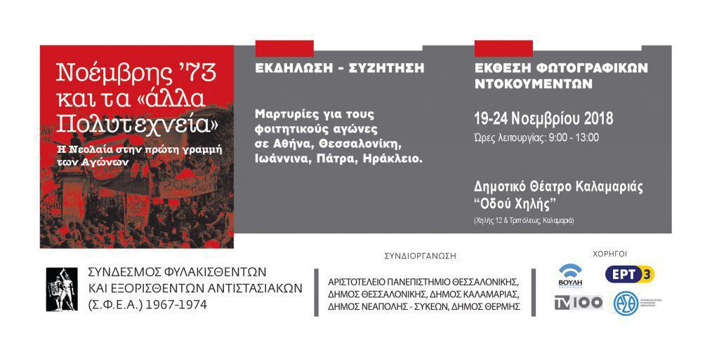 ΄Εκθεση φωτογραφικών ντοκουμέντων από τον αντιδικτατορικό αγώνα με τίτλο «Η νεολαία στην πρώτη γραμμή των αγώνων: Ο Νοέμβρης 1973 και τα άλλα Πολυτεχνεία» από την Δευτέρα 19 Νοεμβρίου στο δημοτικό θέατρο Καλαμαριάς. Η έκθεση περιλαμβάνει φωτογραφικά ντοκουμέντα και ιστορικά τεκμήρια από τους αγώνες των νέων στην Ελλάδα την περίοδο της δικτατορίας.