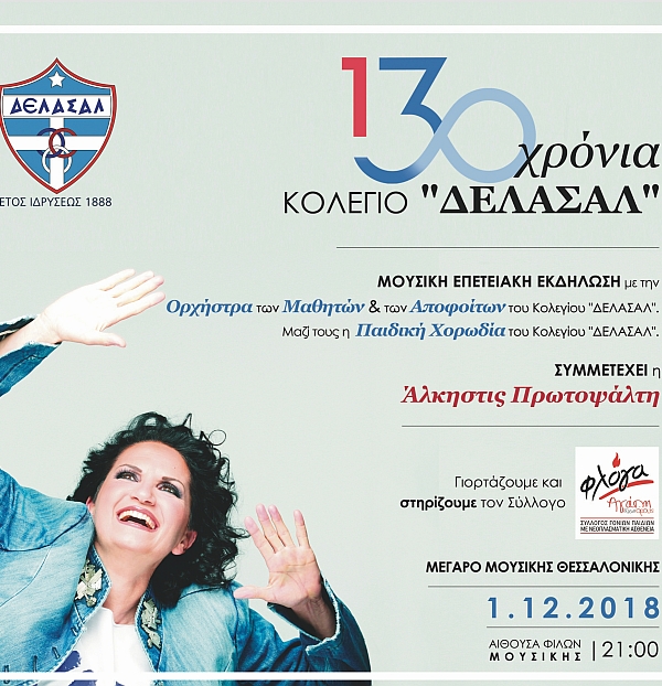 Το Κολέγιο “ΔΕΛΑΣΑΛ” γιορτάζει 130 χρόνια λειτουργίας και εκπαιδευτικής προσφοράς στην πόλη της Θεσσαλονίκης και διοργανώνει, μαζί με τον Σύλλογο Αποφοίτων του Κολεγίου, μια μουσική επετειακή εκδήλωση στο Μέγαρο Μουσικής (Μ1), το Σάββατο 1η Δεκεμβρίου 2018 και ώρα 21.00, στηρίζοντας παράλληλα το σημαντικό έργο του Συλλόγου ΦΛΟΓΑ. Στο πρώτο μέρος θα εμφανιστούν η Ορχήστρα των μαθητών και αποφοίτων του Κολεγίου “ΔΕΛΑΣΑΛ” και η Παιδική Χορωδία και στο δεύτερο μέρος θα απολαύσουμε τη μοναδική Άλκηστη Πρωτοψάλτη.