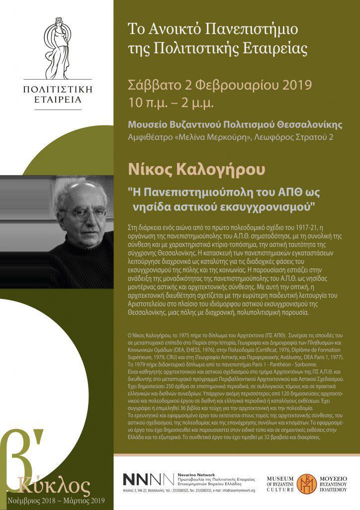 Ο Νίκος Καλογήρου, καθηγητής αρχιτεκτονικού και αστικού σχεδιασμού στο τμήμα Αρχιτεκτόνων της ΠΣ Α.Π.Θ. και διευθυντής στο μεταπτυχιακό πρόγραμμα Περιβαλλοντικού Αρχιτεκτονικού και Αστικού Σχεδιασμού, θα μιλήσει το Σάββατο, στο Αμφιθέατρο του Μουσείου Βυζαντινού Πολιτισμού, στο πλαίσιο του Β’ Κύκλου του Ανοικτού Πανεπιστημίου της Πολιτιστικής Εταιρείας, με θέμα: “Η Πανεπιστημιούπολη του Α.Π.Θ. ως νησίδα αστικού εκσυγχρονισμού”.
