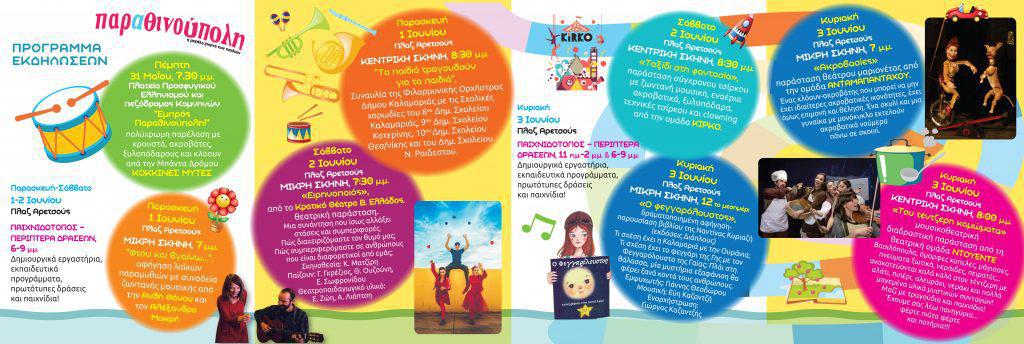 Tο παιδικό φεστιβάλ «ΠΑΡΑΘΙΝΟΥΠΟΛΗ», το μεγαλύτερο στη Βόρεια Ελλάδα που πραγματοποιεί ο Δήμος Καλαμαριάς για παιδιά προσχολικής και σχολικής ηλικίας έως 12 ετών, ανοίγει την ερχόμενη Τετάρτη 30 Μαΐου και θα διαρκέσει έως και την Κυριακή 3 Ιουνίου 2018 στην πλαζ Αρετσούς. Θέμα της φετινής διοργάνωσης «Παίζοντας επικοινωνούμε , παίζοντας μαθαίνουμε τον κόσμο».