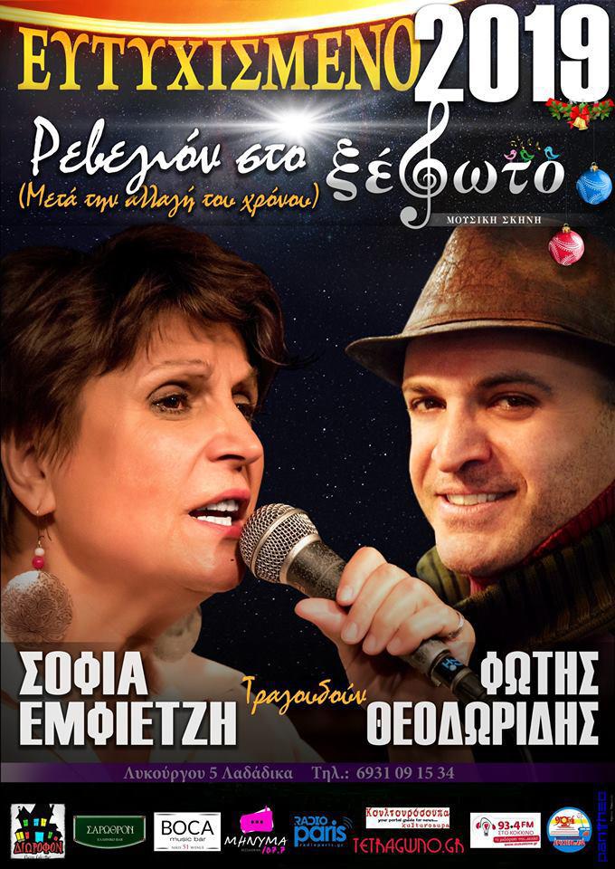 Τη Δευτέρα, 31 Δεκεμβρίου, καλωσορίζουμε το 2019 με τη Σοφία Εμφιετζή και το Φώτη Θεοδωρίδη που μας καλούν για μία νύχτα εκτόνωσης και διασκέδασης, με τραγούδια της καρδιάς και του έρωτα, του νταλγκά και της πεθυμιάς, από αυτά που «μιλάνε» στη ψυχή μας. Γιορτάζουμε τη νέα χρονιά με λαϊκή μουσική, πενιές και αυθεντικό ελληνικό κέφι.