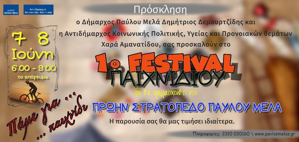 Ο Δήμος Παύλου Μελά διοργανώνει με την Αντιδημαρχία Κοινωνικής Πολιτικής το 1ο Φεστιβάλ Παιχνιδιού και ανοίγει την αγκαλιά του σε όλη την πόλη, μεταμορφώνοντας το στρατόπεδο σε ένα τεράστιο παιχνιδότοπο με περισσότερες από 40 δράσεις και σύνθημα το Πάμε για … Παιχνίδι!