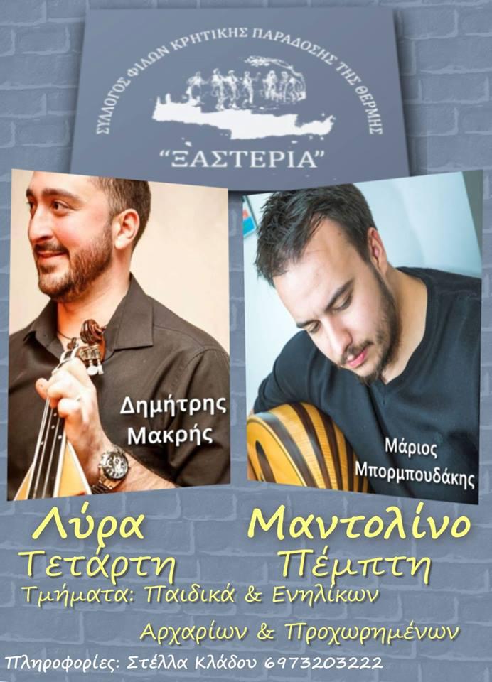 Ο Σύλλογος Φίλων Κρητικής Παράδοσης «Ξαστεριά» Θέρμης μέσα στις πολύπλευρες δράσεις του έχει την εκμάθηση παραδοσιακών κρητικών μουσικών οργάνων. Έτσι, με τους αξιόλογους δεξιοτέχνες δασκάλους Δημήτρη Μακρή στη λύρα και Μάριο Μπορμπουδάκη σε λαούτο-μαντολίνο πραγματοποιούνται τα τμήματα παίδων και ενηλίκων αρχαρίων και προχωρημένων κάθε Τετάρτη και Πέμπτη αντίστοιχα.