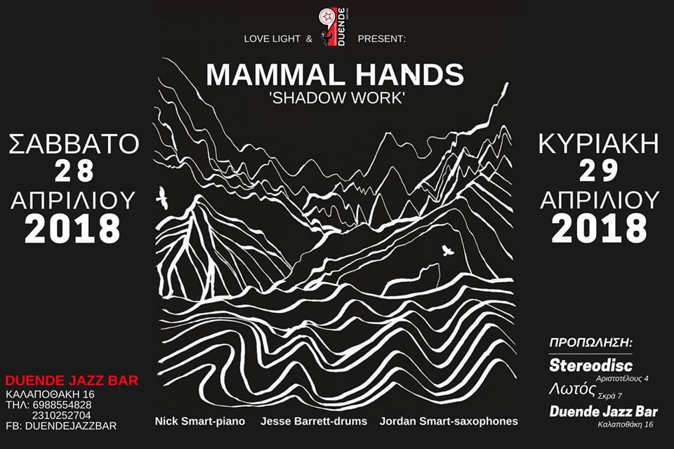ν αναρωτιόσασταν τι θα προέκυπτε στην περίπτωση που αναμιγνύατε τη μουσική του Steve Reich ή του Philip Glass με ρυθμικές λούπες, ηλεκτρονικούς ήχους και παραδοσιακές μελωδίες, τότε η εμφάνιση των Mammal Hands είναι μία εμφάνιση που δεν πρέπει να χάσετε.