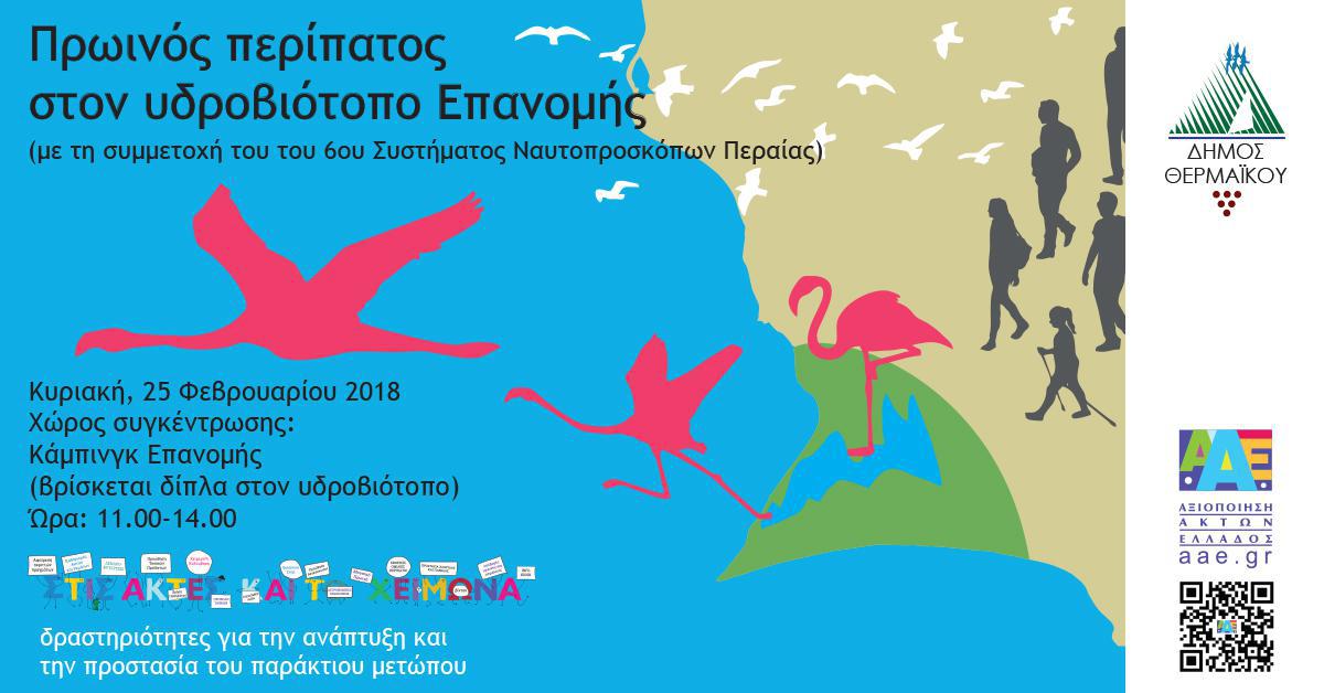 Σε αυτήν ακριβώς την όαση λαμβάνει χώρα, την Κυριακή 25 Φεβρουαρίου και ώρα 11.00 – 14.00, μία δράση, χορηγός επικοινωνίας της οποίας είναι η ΕΡΤ3, η οποία καλεί δημότες και επισκέπτες να δώσουν το παρόν, απολαμβάνοντας το κυριακάτικο πρωινό, κάνοντας τον περίπατό τους στον υδροβιότοπο της Επανομής. Η εκδήλωση πραγματοποιείται στα πλαίσια του προγράμματος εκδηλώσεων ΣΤΙΣ ΑΚΤΕΣ ΚΑΙ ΤΟ ΧΕΙΜΩΝΑ, που συνδιοργανώνεται από το Δήμο Θερμαϊκού και την εταιρεία ΑΑΕ / Αξιοποίηση Ακτών Ελλάδος.