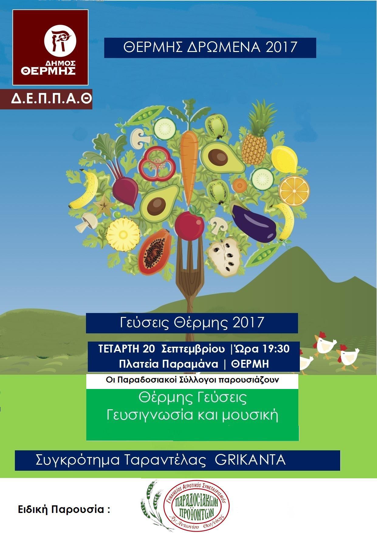 Γιορτή ΑΝΑΚΥΚΛΩΣΗΣ 2017 και δράσεις για παιδιά (14/9, πλατεία Παραμάνα Θέρμης), Χορευτικό Αντάμωμα Παραδοσιακών Συλλόγων (15/9, πλατεία Παραμάνα Θέρμης), Συναυλία Φιλαρμονικής Ορχήστρας Θέρμης & Σχολή Χορού Δ.Ε.Π.Π.Α.Θ. (16/9, Κεντρική πλατεία Θέρμης), ΣΤΑΥΡΕΤΚΑ 2017, Παραδοσιακό Ποντιακό Γλέντι και το πανηγύρι του Σταυρού (16/9, Αλσος Τράπεζας –Τούμπα, Θέρμη), Παραδοσιακή Γιορτή με τον Σύλλογο Σαρακατσαναίων (16/9, Γήπεδο Αγ. Παρασκευής), ΛΑ.ΧΟ.ΣΥ.ΒΑ Ετήσιο Παιδικό Φεστιβάλ Παραδοσιακών Χορών (17/9, Κινηματοθέατρο Άλσος, Βασιλικά), Θέρμης Γεύσεις με Γευσιγνωσία και μουσική (20/9, πλατεία Παραμάνα Θέρμης), Κρητικό γλέντι (22/9, Άγιος Τρύφωνας) και Γιορτή Σπανακιού (23/9, Κεντρική πλατεία Αγ. Παρασκευής).