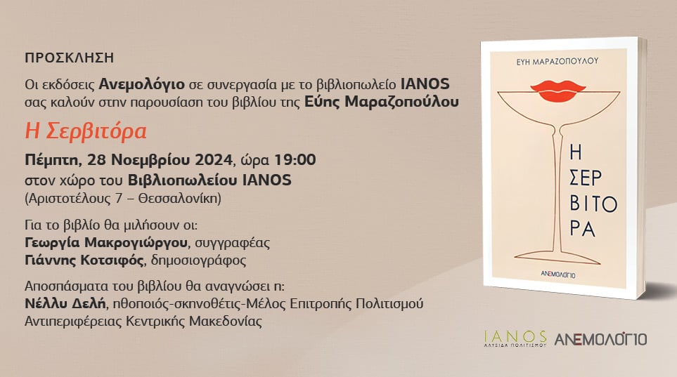 Την Πέμπτη, 28 Νοεμβρίου 2024, στις 19:00 η Αλυσίδα Πολιτισμού IANOS και οι Εκδόσεις Ανεμολόγιο, διοργανώνουν παρουσίαση του βιβλίου «Η Σερβιτόρα» της Εύης Μαραζοπούλου. Ένα βιβλίο για προκλήσεις και διλήμματα, μυστικά και πάθη που αντιμετωπίζουν τα νεαρά άτομα στην επαρχία και όχι μόνο.