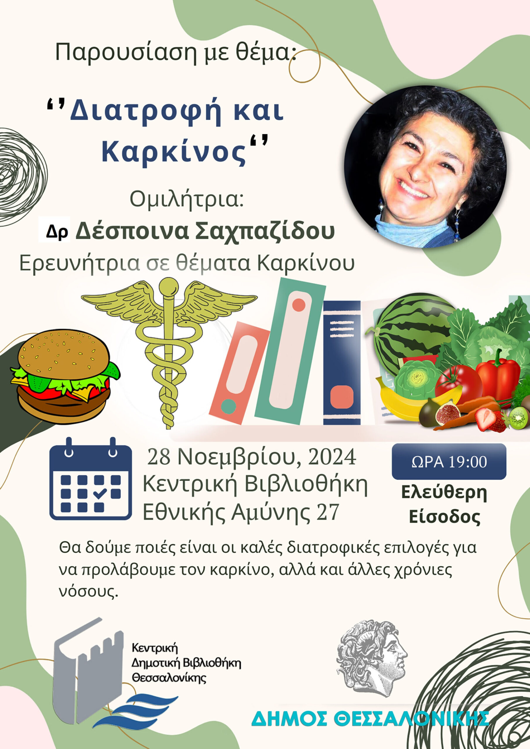 Η Κεντρική Βιβλιοθήκη του Δήμου Θεσσαλονίκης προσκαλεί σε ομιλία με θέμα «Διατροφή και Καρκίνος», με εισηγήτρια την Δρ. Δέσποινα Σαχπαζίδου, την Πέμπτη 28 Νοεμβρίου 2024, στις 7 μ.μ. στην Αίθουσα Εκδηλώσεών της, στον 2ο όροφο.