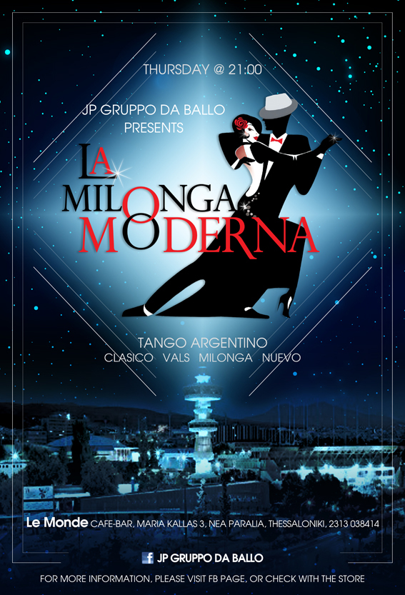 Η ομάδα χορού, JP gruppo da ballo, σας προσκαλεί σε μαγικές βραδιές Αργεντίνικου Τάνγκο, με τον Ιωάννη και την Ευγενία !!! Η συνάντησή μας, την Πέμπτη, στις 21:00, στο Le Monde !