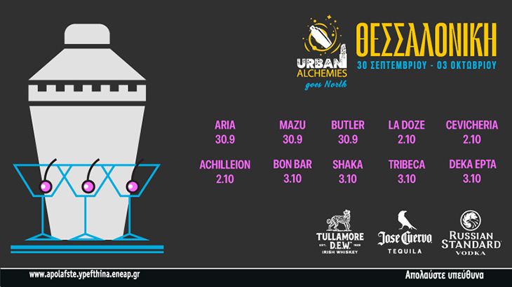 Μετά από 2 επιτυχημένες χρονιές στην Αθήνα, τα Urban Alchemies parties, «ανεβαίνουν» βόρεια! Στις 30 Σεπτεμβρίου και στις 2 & 3 Οκτωβρίου, 10 εμβληματικά bars της Θεσσαλονίκης, υποδέχονται κορυφαίους bartenders από το εξωτερικό αλλά και μερικά από τα πιο δημοφιλή bars της Ελλάδας και προσκαλούν το κοινό της συμπρωτεύουσας να διασκεδάσει στους ρυθμούς των Urban Alchemies parties. Πρωταγωνιστές αυτού του ταξιδιού, είναι η Russian Standard Vodka, το Tullamore D.E.W Irish Whiskey και η Jose Cuervo Tequila!