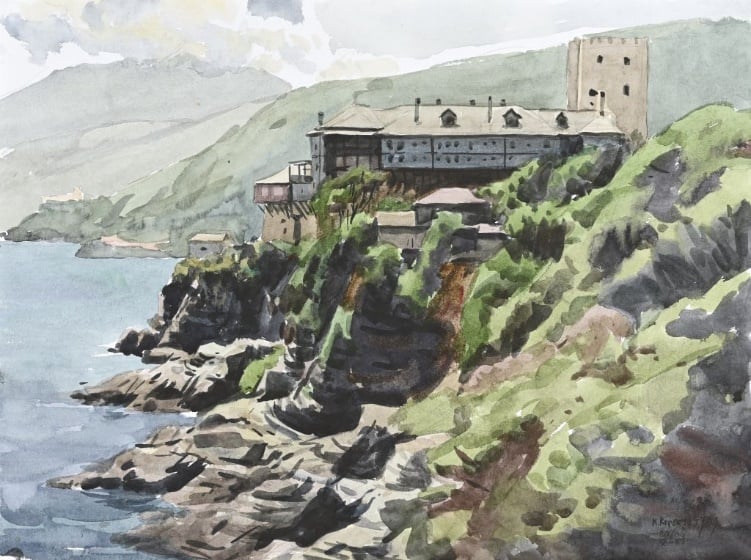 Κωνσταντίνος Κερεστετζής έκθεση “Ακουαρέλες από το Άγιον Όρος” | Αγιορείτικη εστία, κτίριο Νεδέλκου