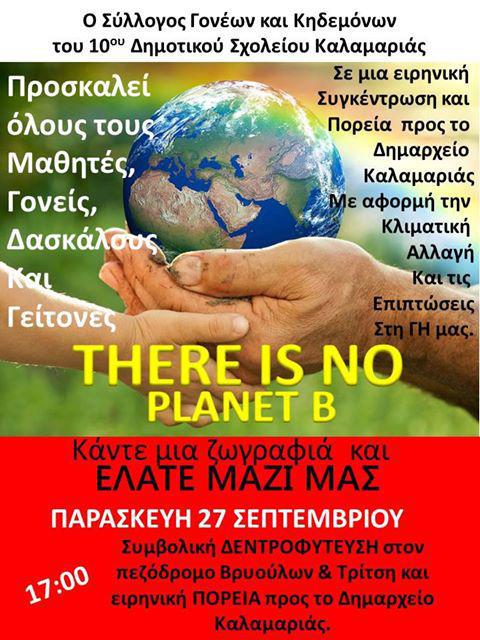 Το 10ο Δημοτικό Σχολείο Καλαμαριάς προσκαλεί μικρούς και μεγάλους να συμμετέχουν στην δράση και να ανταποκριθούν στο κάλεσμα, απαιτώντας την λήψη μέτρων για την προστασία του πλανήτη και άμεσες δράσεις για την αντιμετώπιση της κλιματικής αλλαγής.