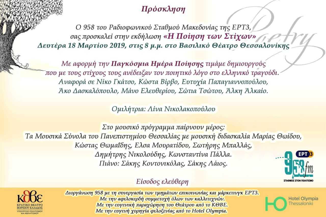 Με αφορμή την Παγκόσμια Ημέρα Ποίησης, ο 95.8 του Ρ.Σ.Μακεδονίας της ΕΡΤ3, σας προσκαλεί στην εκδήλωση “Η Ποίηση των Στίχων” που διοργανώνει στο Βασιλικό Θέατρο του Κ.Θ.Β.Ε. (30ης Οκτωβρίου 2, πλατεία Λευκού Πύργου), τη Δευτέρα 18 Μαρτίου 2019, στις 20:00. Ομιλήτρια θα είναι η σπουδαία Λίνα Νικολακοπούλου.