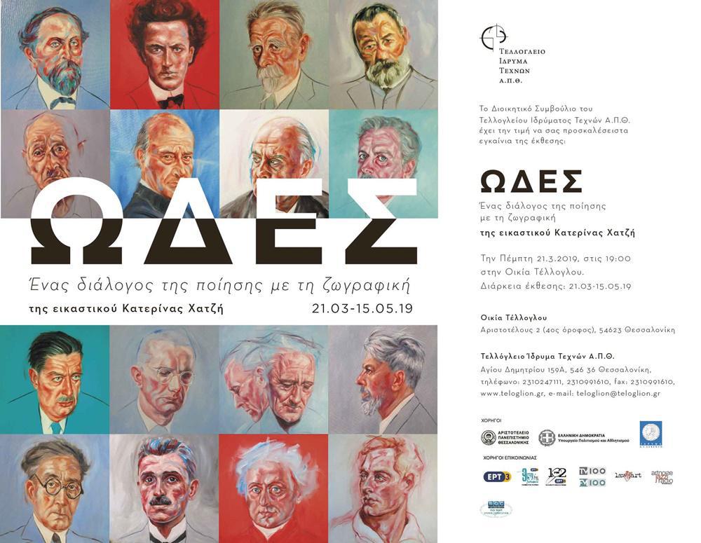 Άγγελος Σικελιανός, Αλέξανδρος Παπαδιαμάντης, Οδυσσέας Ελύτης, Γιώργος Σεφέρης, Γιάννης Ρίτσος, Μ. Καραγάτσης, Ανδρέας Εμπειρίκος, Κωνσταντίνος Καβάφης, Διονύσιος Σολωμός, Κωστής Παλαμάς, είναι ορισμένα από τα πορτρέτα προσωπικοτήτων της ποίησης και της λογοτεχνίας που φιλοτέχνησε η Κατερίνα Χατζή και θα παρουσιαστούν στην έκθεση «ΩΔΕΣ», στην Οικία Τέλλογλου (Αριστοτέλους 2, 4ος όροφος). Τα εγκαίνια της έκθεσης θα πραγματοποιηθούν την Πέμπτη 21 Μαρτίου 2019 και ώρα 19.00, στην Οικία Τέλλογλου.