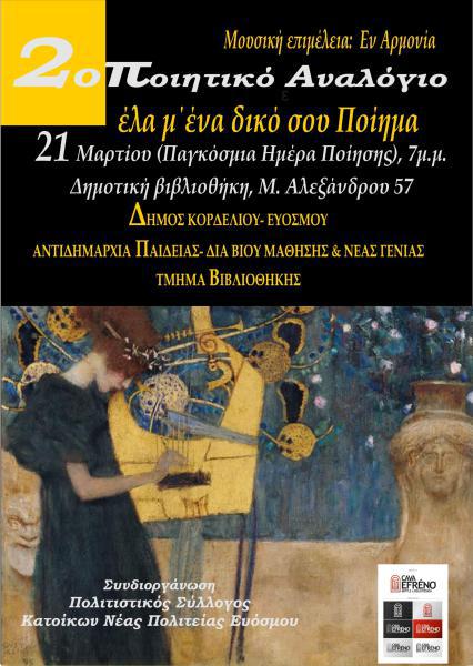 Την Παγκόσμια Ημέρα Ποίησης θα γιορτάσει ο Δήμος Κορδελιού Ευόσμου την 21η Μάρτη, ημέρα Πέμπτη, με μία εκδήλωση αφιερωμένη στην ποίηση με τίτλο «2ο ΠΟΙΗΤΙΚΟ ΑΝΑΛΟΓΙΟ, έλα μ’ ένα δικό σου ποίημα». Μικροί και μεγάλοι, μαθητές κι ενήλικες, είναι καλεσμένοι σε μία γιορτή αφιερωμένη στην ποιητική τέχνη. Ο καθένας μπορεί να απαγγείλει δικά του ποιήματα ή ποιήματα αγαπημένων δημιουργών συνεισφέροντας στη γιορτή στη Δημοτική Βιβλιοθήκη του Πολιτιστικού Κέντρου Ευόσμου (Μεγάλου Αλεξάνδρου 57). Η εκδήλωση διοργανώνεται από την Αντιδημαρχία Παιδείας – Δια Βίου Μάθησης – Νέας Γενιάς και το τμήμα Βιβλιοθήκης Ευόσμου με συνδιοργάνωση του Πολιτιστικού Συλλόγου Κατοίκων Νέας Πολιτείας Ευόσμου. Για πρώτη φορά θα πραγματοποιηθεί στον φυσικό της χώρο. Μουσικοί της Μουσικής Σχολής «Εν Αρμονία» θα ερμηνεύσουν μελοποιημένα ποιήματα των: Ρίτσου, Βάρναλη, Γκάτσου, Καβάφη κ.ά.