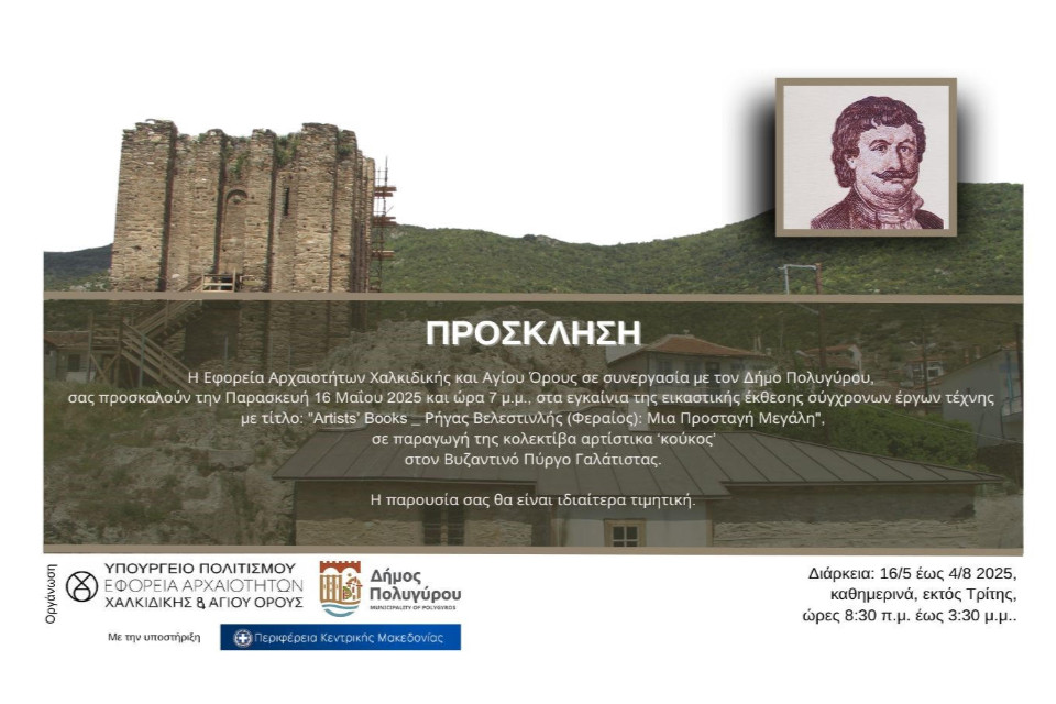 Με αφορμή τη συμπλήρωση 227 χρόνων από τη θανάτωση του Ρήγα Βελεστινλή – Φεραίου, ο Δήμος Πολυγύρου, σε συνεργασία με την Εφορεία Αρχαιοτήτων Χαλκιδικής & Αγίου Όρους και με την υποστήριξη της Περιφέρειας Κεντρικής Μακεδονίας, διοργανώνει έκθεση με έργα σύγχρονης τέχνης με τίτλο: “Artists’ Books Ρήγας Βελεστινλής (Φεραίος): Μια Προσταγή Μεγάλη”.
