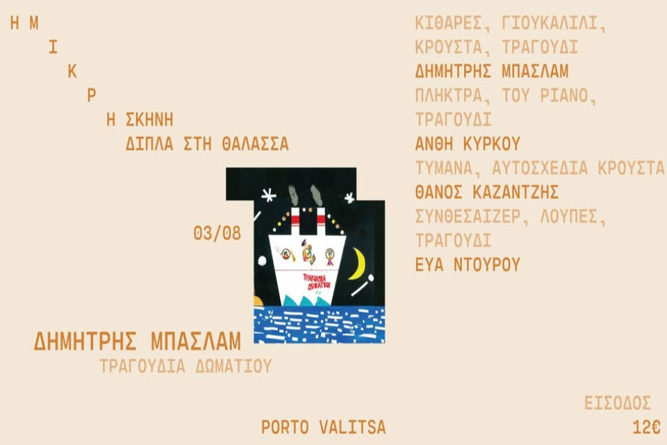 Ο Δημήτρης Μπασλάμ, μουσικός, τραγουδοποιός και συγγραφέας παιδικών παραμυθιών (όπως “Ο Γαργαλιστής”, “Ο Αγησίλαος”, “Η Θυμωμένη Μπετονιέρα”, “Τα Παπούτσια του Βαρύτονου” και πολλά άλλα), παρουσιάζει την Κυριακή 3 Αυγούστου στο θεατράκι του Porto Valitsa τα “Τραγούδια Δωματίου”. Οι ήρωες των παραμυθιών του ζωντανεύουν δίπλα στη θάλασσα, τραγουδούν και ενθαρρύνεται η συμμετοχή παιδιών και γονέων.