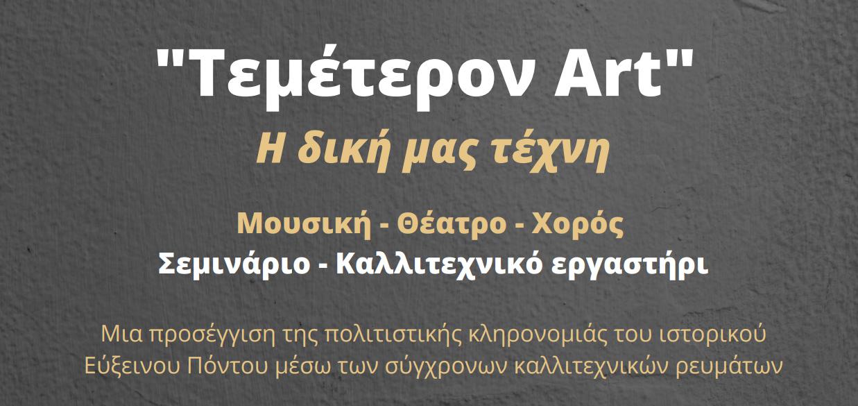 Μια προσέγγιση της κουλτούρας και κληρονομιάς του ιστορικού Εύξεινου Πόντου μέσω των σύγχρονων καλλιτεχνικών ρευμάτων, επιχειρεί να κάνει το εργαστήριο “Τεμέτερον Art – Η δική μας τέχνη” που απευθύνεται κυρίως σε παιδιά και εφήβους (12-18 ετών) αλλά και σε ενήλικους νέους που ενδιαφέρονται για τις παραστατικές τέχνες αλλά και την ποντιακή κουλτούρα. Θα επιχειρηθεί ο συνδυασμός των δύο και η εξέτασή τους μέσα από ένα διαφορετικό και δημιουργικό πρίσμα, αυτό των σύγχρονων καλλιτεχνικών ρευμάτων και μορφών έκφρασης.