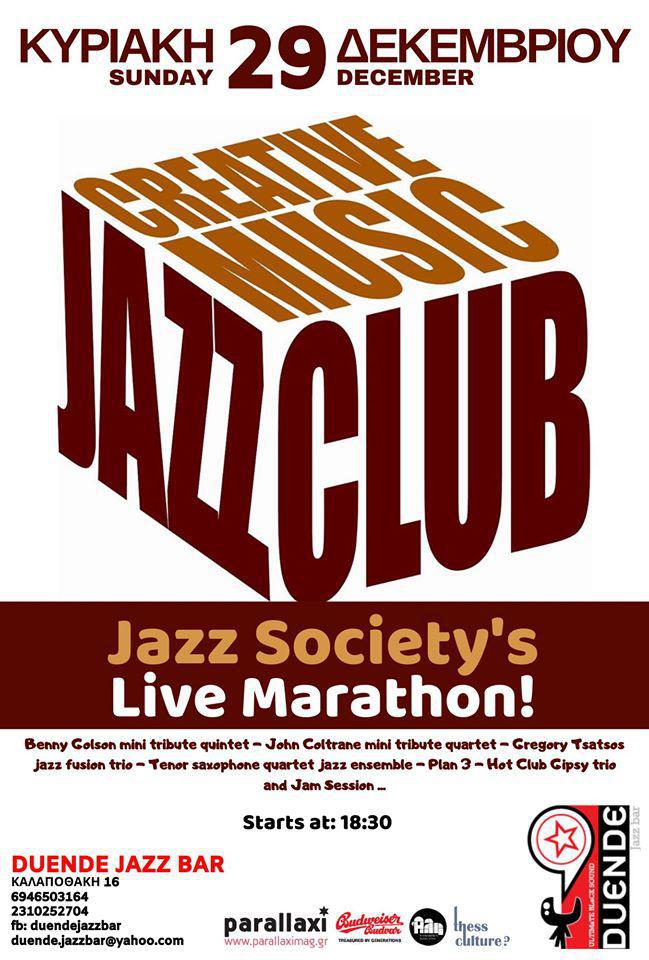 Ο “Σύλλογος φίλων της τζαζ και δημιουργικής μουσικής” σε συνεργασία με το Duende Jazz Bar διοργανώνει μία μεγάλη γιορτή – μαραθώνιο ζωντανής μουσικής, λίγο πριν την εκπνοή της χρονιάς. Ο χαρακτήρας της εκδήλωσης είναι μη κερδοσκοπικός και μεγάλο μέρος των εσόδων της βραδιάς θα διατεθεί στη διεκπεραίωση της εκκαθάρισης του συλλόγου.