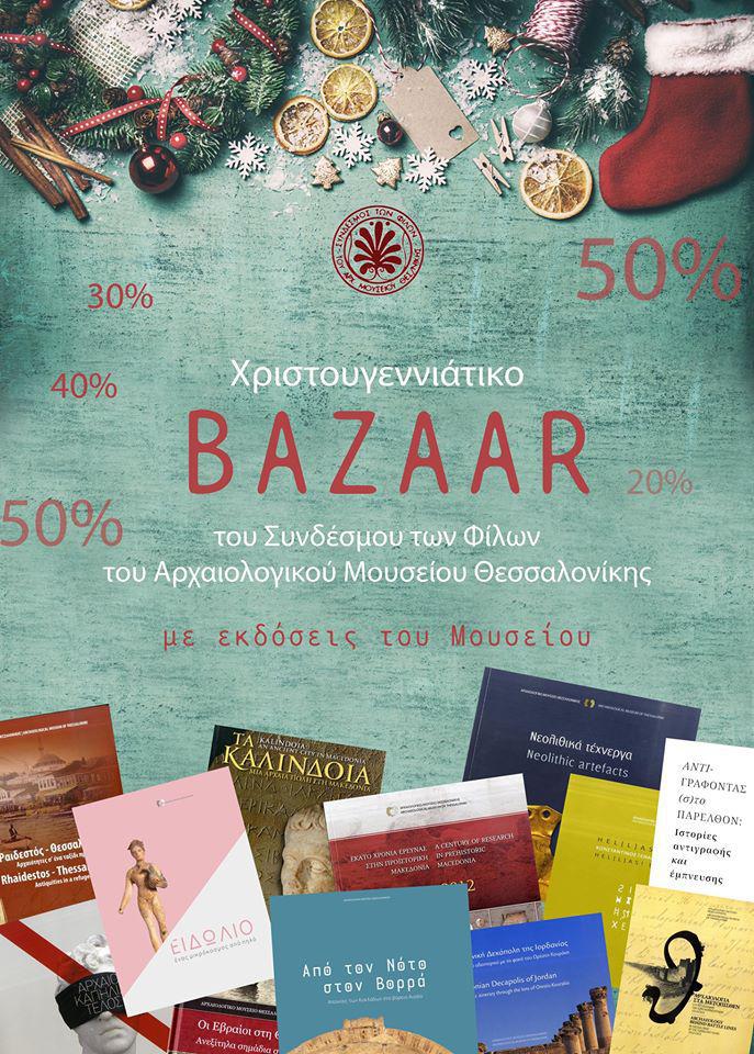 Bazaar εκδόσεων του Συνδέσμου των Φίλων του Αρχαιολογικού Μουσείου Θεσσαλονίκης. Θα διατίθενται οι εκδόσεις του Μουσείου (κατάλογοι εκθέσεων, πρακτικά συνεδρίων και ημερίδων, τιμητικοί τόμοι, λευκώματα) σε μειωμένες τιμές. Η καλύτερη ιδέα για χριστουγεννιάτικο δώρο!