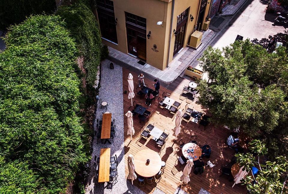 Στην αυλή του Beyond the Walls, με ένα δροσερό ποτό στα χέρια, urban casual cuisine πιάτα να το συνοδεύουν, στην αρχή της Φράγκων, εκεί που χτυπάει ταυτόχρονα το παρελθόν και το παρόν των μητροπολιτικών μας αισθήσεων στη Θεσσαλονίκη.