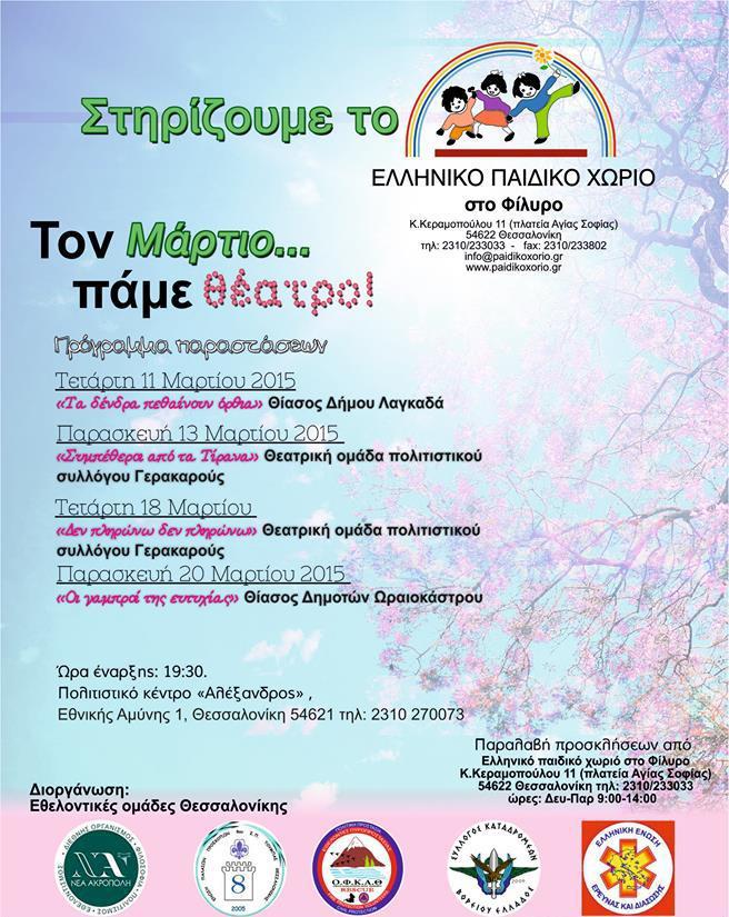 Πέντε εθελοντικές ομάδες της Πολιτικής Προστασίας στηρίζουν το Ελληνικό παιδικό χωριό Φιλύρου. Η Ελληνική Ένωση Έρευνας και Διάσωσης Θεσσαλονίκης , Η Ένωση Παλαιών Προσκόπων 8ου Συστήματος Τούμπας Θεσσαλονίκης, Ο Όμιλος Φίλων Κυνηγών Ακτής Θερμαϊκού, Ο Σύλλογος Καταδρομέων Βορείου Ελλάδος , και Η Νέα Ακρόπολη Θεσσαλονίκης, διοργανώνουν 4 θεατρικές παραστάσεις στο Πολιτιστικό κέντρο «Αλέξανδρος» (Εθνικής Αμύνης […]