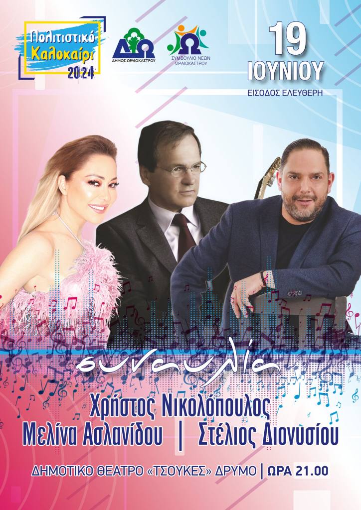 Συναυλία με μεγάλες επιτυχίες του Χρήστου Νικολόπουλου, της Μελίνας Ασλανίδου και του Στέλιου Διονυσίου θα πραγματοποιηθεί στο πλαίσιο των εκδηλώσεων «Πολιτιστικό Καλοκαίρι 2024» του Δήμου Ωραιοκάστρου.
