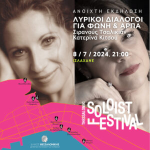 Η σοπράνο Σιρανούς Τσαλικιάν και η αρπίστρια Κατερίνα Κίτσου συμπράττουν για μία συναυλία, με τίτλο Λυρικοί Διάλογοι για Φωνή και Άρπα, στο πλαίσιο του Thessaloniki Soloist Festival 2024, του δήμου Θεσσαλονίκης, στον Πολυχώρο Πολιτισμού του μνημείου Ισλαχανέ, στην Άνω Πόλη Θεσσαλονίκης.