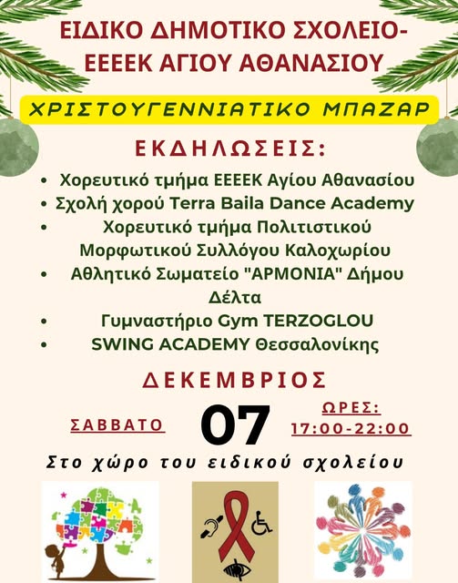 Ο Σύλλογος γονέων κηδεμόνων και φίλων Ε.Ε.Ε.Ε.Κ. Αγίου Αθανασίου σας προσκαλεί στο Χριστουγεννιάτικο παζάρι του, το Σάββατο 7 Δεκεμβρίου 2024 στον χώρο του ειδικού σχολείου Αγίου Αθανασίου .