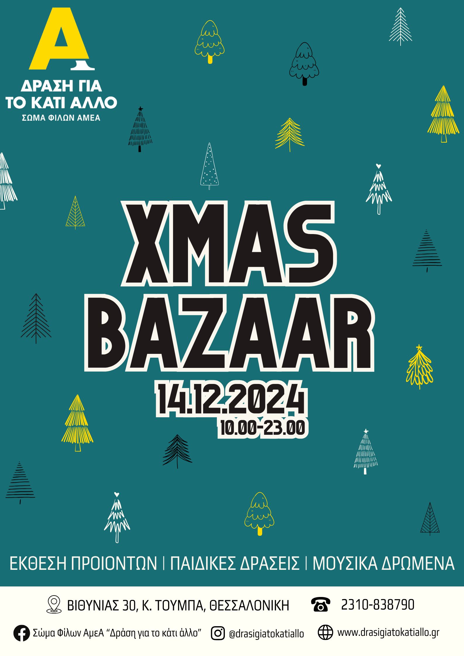 Κατά τη διάρκεια του γιορτινού Bazaar θα βρείτε υπέροχα δώρα, χειροποίητα χριστουγεννιάτικα στολίδια και πολλά άλλα προϊόντα που έχουν φτιαχτεί από τα παιδιά και τους εθελοντές του Σωματείου με φαντασία, μεράκι και αγάπη, αλλά και από αγαπημένους φίλους/ες εκθέτες/τριες. Η δράση ξεκινά από το πρωί με μουσική και δραστηριότητες για μικρά παιδιά και θα αυξάνει «ρυθμό» όσο περνάνε οι ώρες.