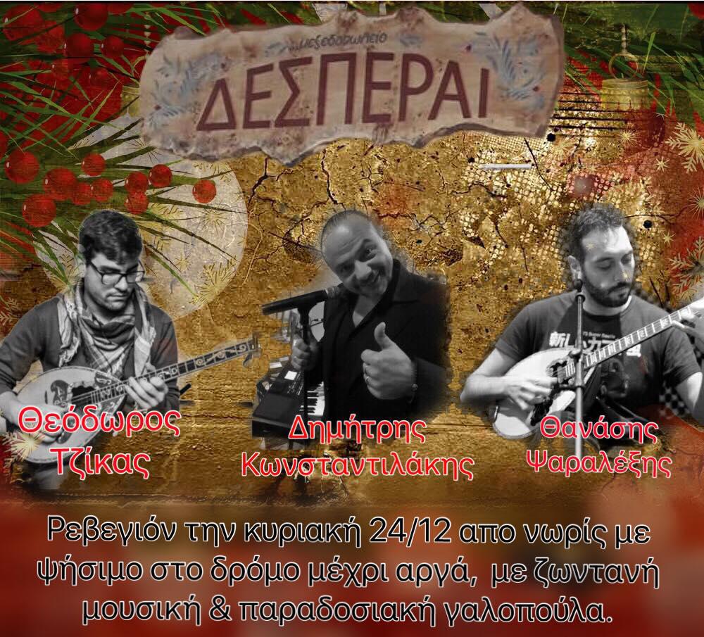 Ένα μεγάλο γλέντι την παραμονή από νωρίς με ψήσιμο στο δρόμο μέχρι αργά με γαλοπούλα και ωραίους μουσικούς που θα δημιουργήσουν μια μοναδική ατμόσφαιρα στην οδό Δεσπεραί μαζί με την εξαιρετική κουζίνα του νέου αγαπημένου στεκιού.