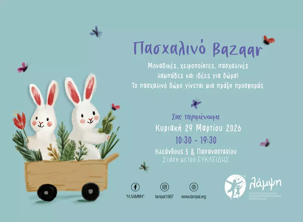 Ο Σύλλογος Λάμψη διοργανώνει και φέτος το καθιερωμένο Πασχαλινό Bazaar την Κυριακή 29 Μαρτίου 2026, από τις 10:30 έως τις 19:30 στα γραφεία της Κλεάνθους 5 & Παπαναστασίου (στάση Ευκλείδης) και προσκαλεί το κοινό να το επισκεφθεί.