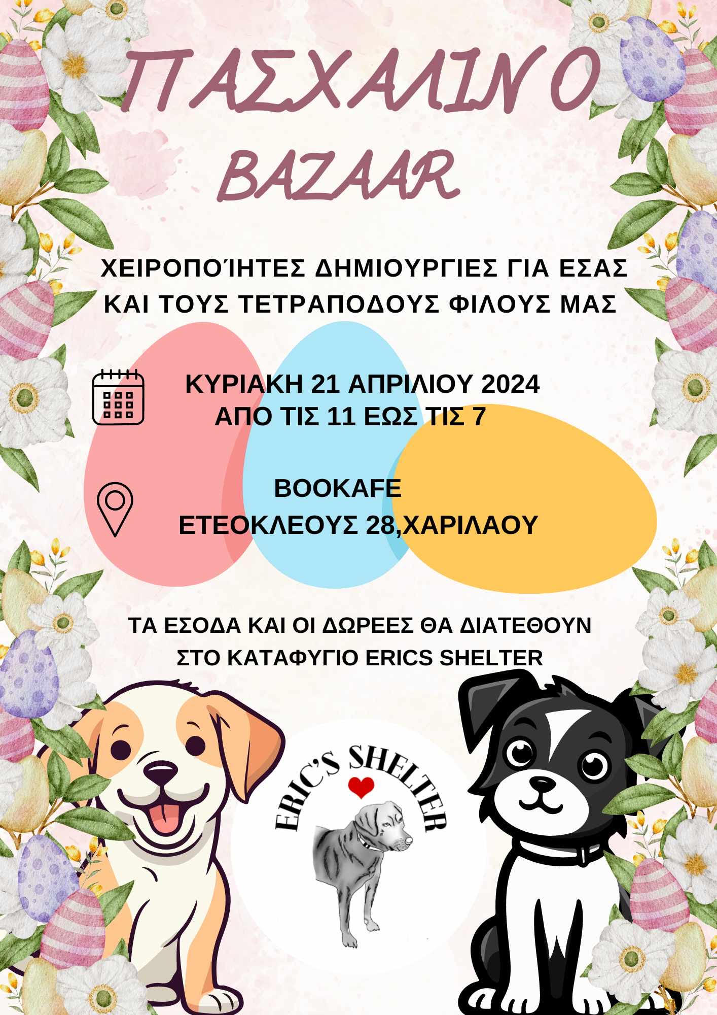 Στην προσπάθεια να βοηθήσουν και πάλι το αγαπημένο Eric’s Shelter και τα 120 σκυλάκια τα οποία φιλοξενεί και περιθάλπει το σπίτι του βιβλίου Bookcafe διοργανώνει ένα ΠΑΣΧΑΛΙΝΟ BAZAAR. 21 Απριλίου λοιπόν στον χώρο τους από τις 11 έως τις 7 το απόγευμα.