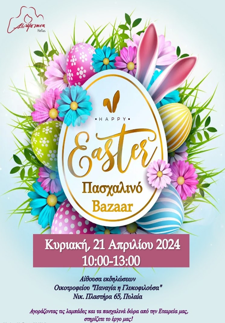 Η Ελληνική Εταιρεία Νόσου Alzheimer και Συγγενών Διαταραχών σας προσκαλεί την Κυριακή 21 Απριλίου, μετά τις 10:00, στο Πασχαλινό Bazaar στην Aίθουσα εκδηλώσεων του Οικοτροφείου «Παναγία Η Γλυκοφιλούσα» (Ν. Πλαστήρα 65, Χαριλάου – στάση Παπανακλή Λεωφορεία 11, 58).
