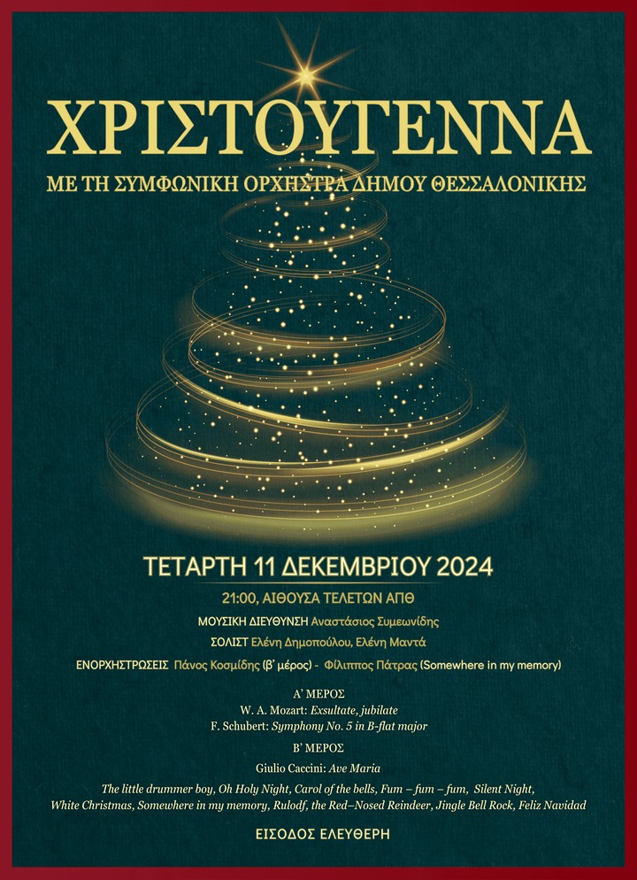 Η Συμφωνική Ορχήστρα Δήμου Θεσσαλονίκης σας προσκαλεί σε μία Χριστουγεννιάτικη συναυλία που περιλαμβάνει έργα Mozart, Schubert, Caccini και υπέροχα χριστουγεννιάτικα τραγούδια, με είσοδο ελεύθερη για όλους.