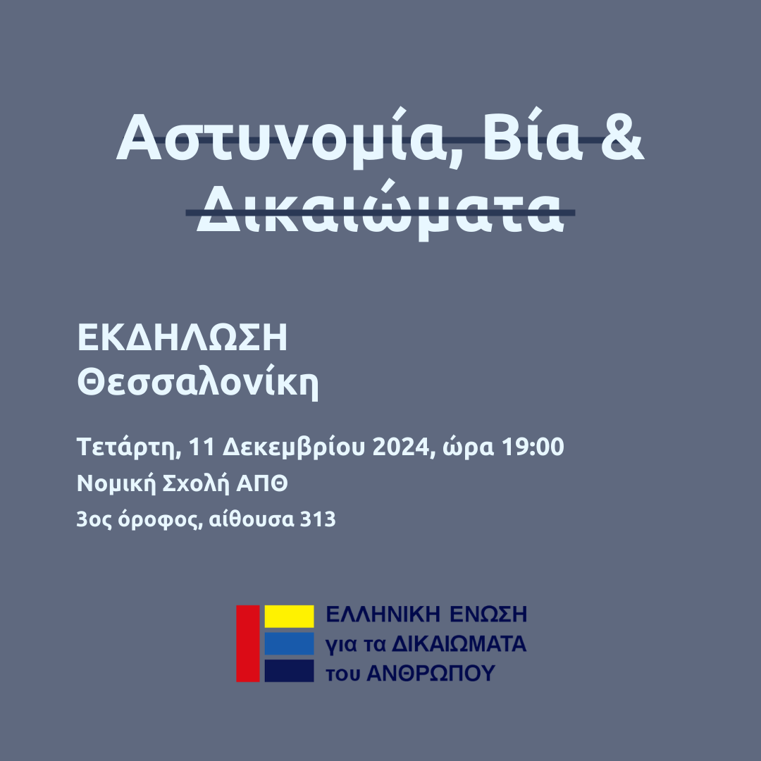 Η Ελληνική Ένωση για τα Δικαιώματα του Ανθρώπου (ΕλΕΔΑ) σε συνέχεια της δημοσίευσης της μελέτης με τίτλο “Αστυνομία, βία και δικαιώματα: μια επισκόπηση της αστυνομικής αυθαιρεσίας στην Ελλάδα” διοργανώνει εκδήλωση παρουσίασης και στη Θεσσαλονίκη.