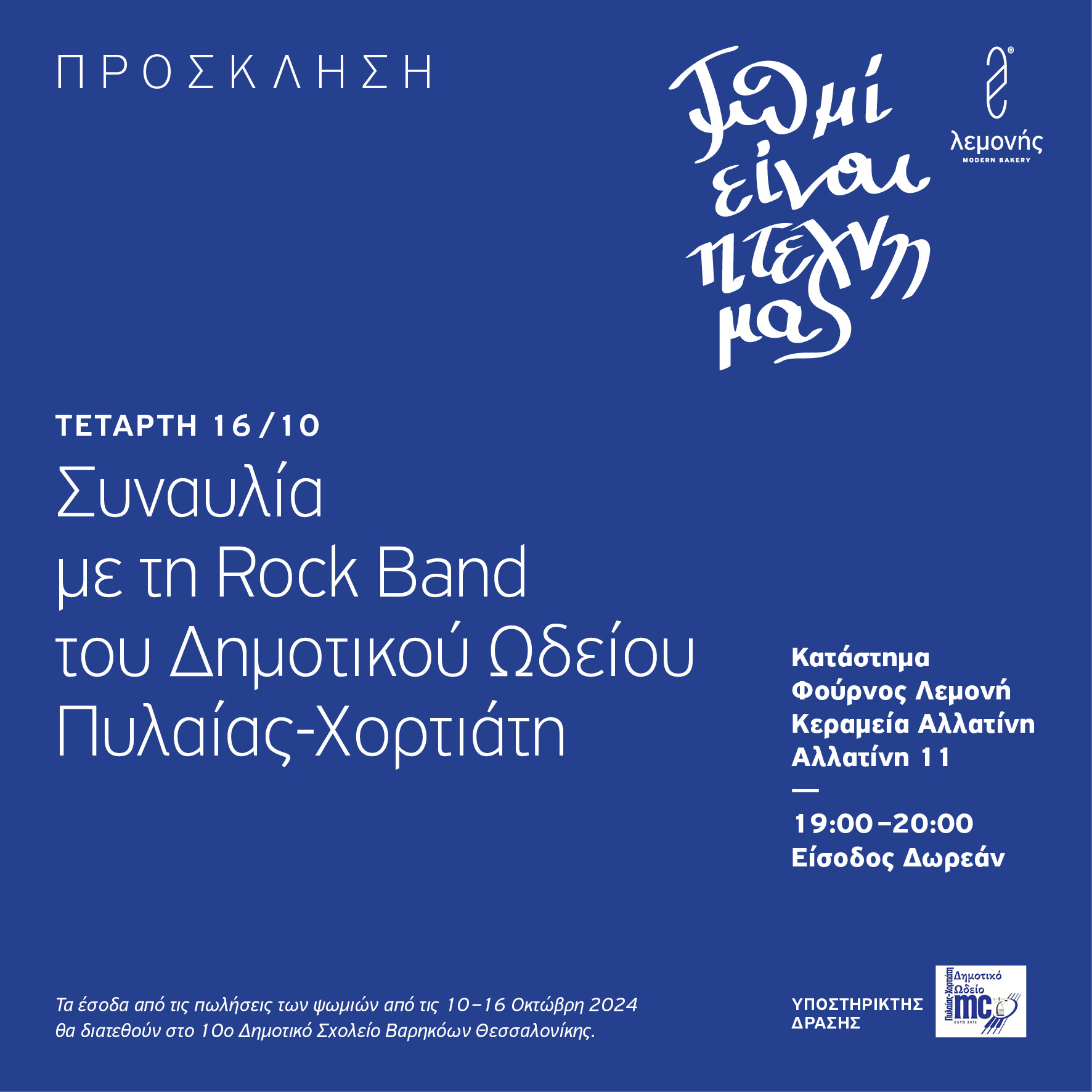Σήμερα, ο φούρνος “Λεμονής”, διαθέτει το χώρο του στην Rock Band του Δημοτικού Ωδείου Πυλαίας-Χορτιάτη, για μια αξέχαστη συναυλία. Για μία ώρα, από τις 19:00 έως τις 20:00, οι παρευρισκόμενοι θα έχουν την χαρά να απολαύσουν ένα μουσικό ταξίδι, με “οδηγούς” νέους μουσικούς με όραμα και ταλέντο.