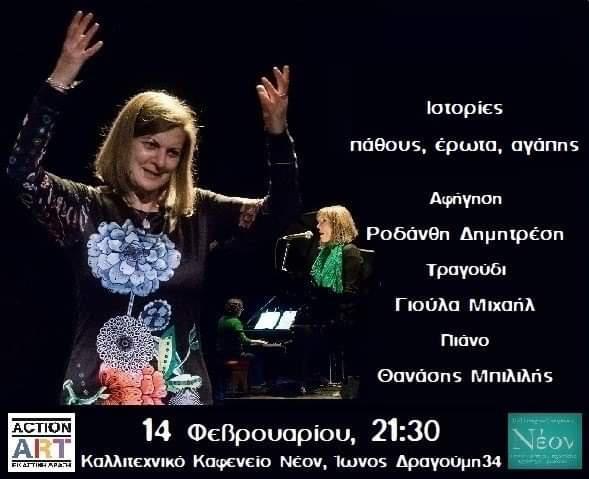 Ιστορίες πάθους, έρωτα, αγάπης σε μία παράσταση αφήγησης για ενήλικες στο Νέον ανήμερα Αγίου Βαλεντίνου. Μια βραδιά με ιστορίες ομορφιάς, γεμάτες πάθος, έρωτα, αγάπη που οδηγούν στα μονοπάτια του άγνωστου, του φόβου, του θαυμαστού, του φανταστικού, του αληθινού, εκεί όπου ο άνθρωπος μετρά το σκοτάδι και το φως της ύπαρξής του, το νόημα της. Το νήμα της αφήγησης θα ξεδιπλώσει η Ροδάνθη Δημητρέση με παραμύθια από διάφορα μέρη του κόσμου. Την αφήγηση θα πλαισιώσουν οι εξαίρετοι μουσικοί, Γιούλα Μιχαήλ με την αισθαντική της φωνή να ερμηνεύει τραγούδια ενώ ο Θανάσης Μπιλιλής θα συνοδεύει με τους ήχους του πιάνου.