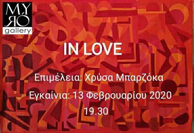 Φτερουγίσματα στο στήθος, τρελά καρδιοχτύπια, βέλη που τρυπάνε κατάκαρδα στη συλλογική φαντασία του μεγαλύτερου μέρους της ανθρωπότητας. Ο έρωτας γιορτάζεται στις 14 Φεβρουαρίου μέσω του “Αγίου Βαλεντίνου” ενώ οι έρωτες διανυκτερεύουν κ εφημερεύουν εφ Άπαξ . Ο έρωτας είναι η ζωηρή έλξη μεταξύ δύο προσώπων. Θεωρείται το ισχυρότερο συναίσθημα έλξης το οποίο είναι ήταν κ θα είναι λόγος έμπνευσης αλλά και έκφρασης για εικαστικούς μουσικους ποιητές, θεατρίνους, καλλιτέχνες γενικοτερα… 13 Φεβρουαρίου στις 19.30 στη Μυρό ερωτευμένοι κ μη είστε καλεσμένοι να βιώσετε το πρότζεκτ “IN LOVE” το οποίο επιμελήθηκε η Χρύσα Μπαρζόκα και συμμετέχουν εξαιρετικοί εικαστικοί όπως: